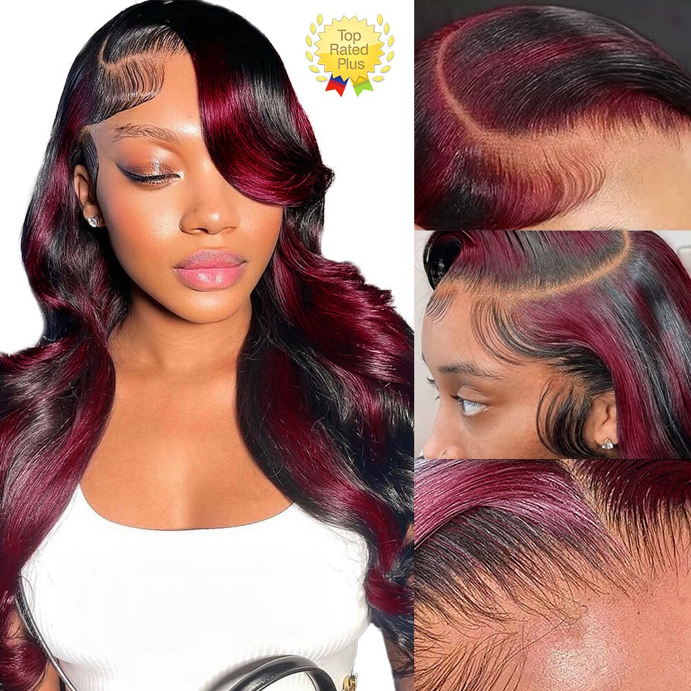Natural Wavy Burgundy Brown Wig With Red Highlights Premium Human Hair Lace Front for Women Glueless HD Lace Full